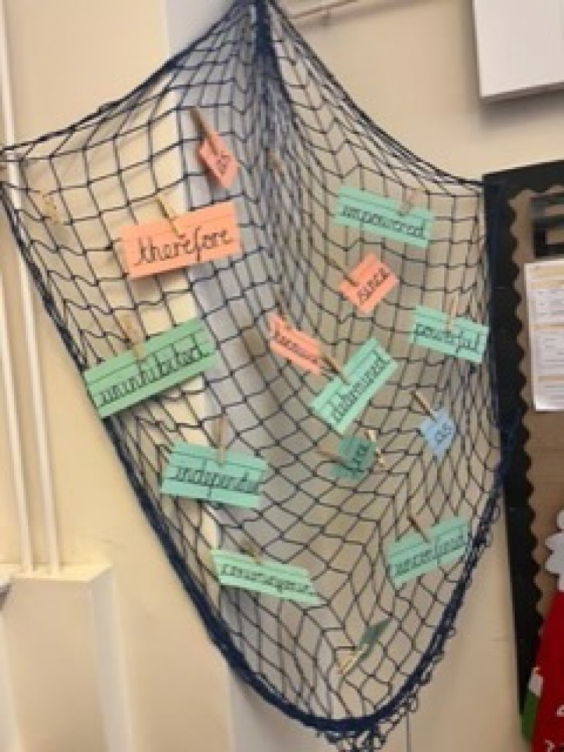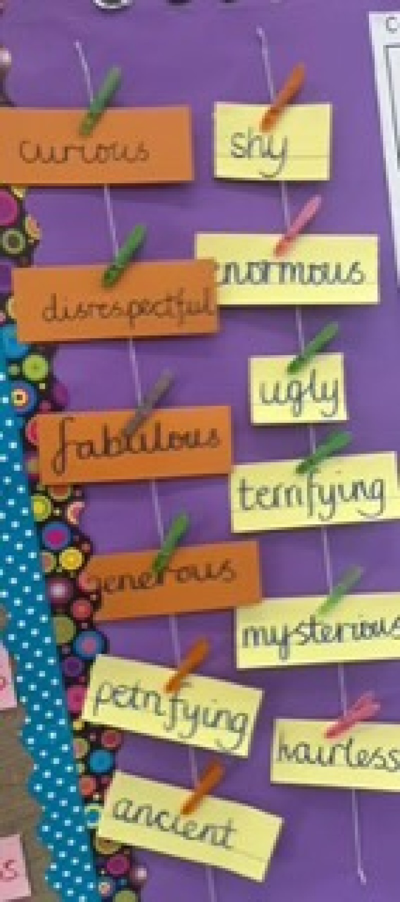 Consider your working wall as a team effort. From your side, display your own live modelling of key skills in context and written outcomes – this could be word or sentence level, or longer modelled paragraphs applying taught skills. The working wall should demonstrate the build-up of contextualised skills into application, including the editing process. As well as this, think about how you can include children’s own work to support others. Rather than displaying finished pieces as examples, think about the process to get there, for example this could be a group character splat that has been created, sentence strip work or post it notes of vocabulary. We want to get to a point where children are saying, “That would be really helpful for our working wall!”. Involving children in the creation of the working wall will not only give them a sense of involvement, but it will make it easier to train them into using it to support their independent writing.