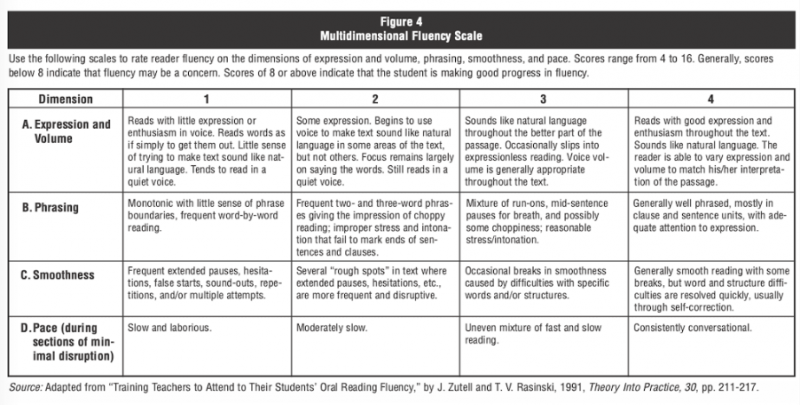 According to researchers Rasinski and Padak1, reading fluently has three main components. Fluent readers read with accuracy and automaticity. This frees the reader’s finite cognitive capacity ‘to work on comprehending the text – making predictions, asking questions, creating mental images.’ The third component is prosodic reading; reading with a sense of pace, expression, knowing when to pause, when to change pace and volume. It is important to note here that fluency is not about how fast a child can read but rather reading in a way that bolsters understanding. A useful tool in assessing all aspects of fluency is the Multidimensional Fluency Rubric2 (see below). If a child scores 10+, they are making good progress.