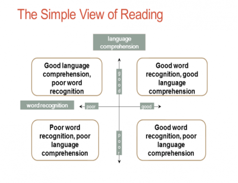 There will be many children who are apt decoders however are unable to construct meaning from what has just been read. They may read with little expression or sense of phrasing. On the other hand, there will be children who struggle to decode words, reading text effortfully word-by-word, even syllable-by-syllable but, when the same text is read to them, can enthusiastically employ a range of comprehension skills in discussion. The Simple View of Reading (see below) is a handy way to plot where children initially sit on this continuum.
