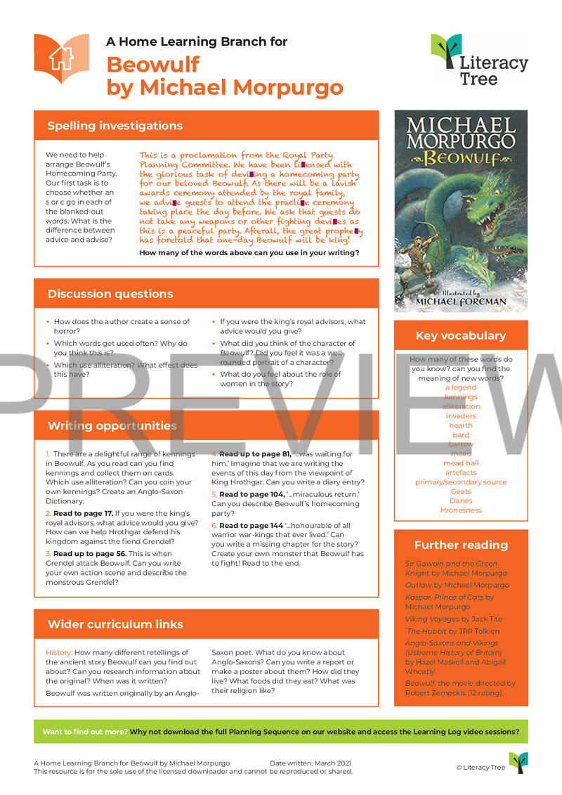 This is a Home Learning Branch for Beowulf. These branches are designed to support home learners to access literature-based learning using a selection of books we love from Writing Roots. They include purposeful writing suggestions, links to the wider curriculum so that texts can be used across other subjects, key questions as well as spelling or phonics investigations.