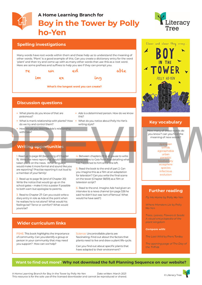 This is a Home Learning Branch for Boy in the Tower. These branches are designed to support home learners to access literature-based learning using a selection of books we love from Writing Roots. They include purposeful writing suggestions, links to the wider curriculum so that texts can be used across other subjects, key questions as well as spelling or phonics investigations.