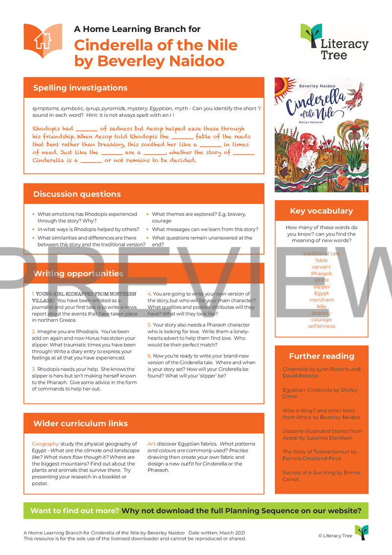 This is a Home Learning Branch for Cinderella of the Nile. These branches are designed to support home learners to access literature-based learning using a selection of books we love from Writing Roots. They include purposeful writing suggestions, links to the wider curriculum so that texts can be used across other subjects, key questions as well as spelling or phonics investigations.