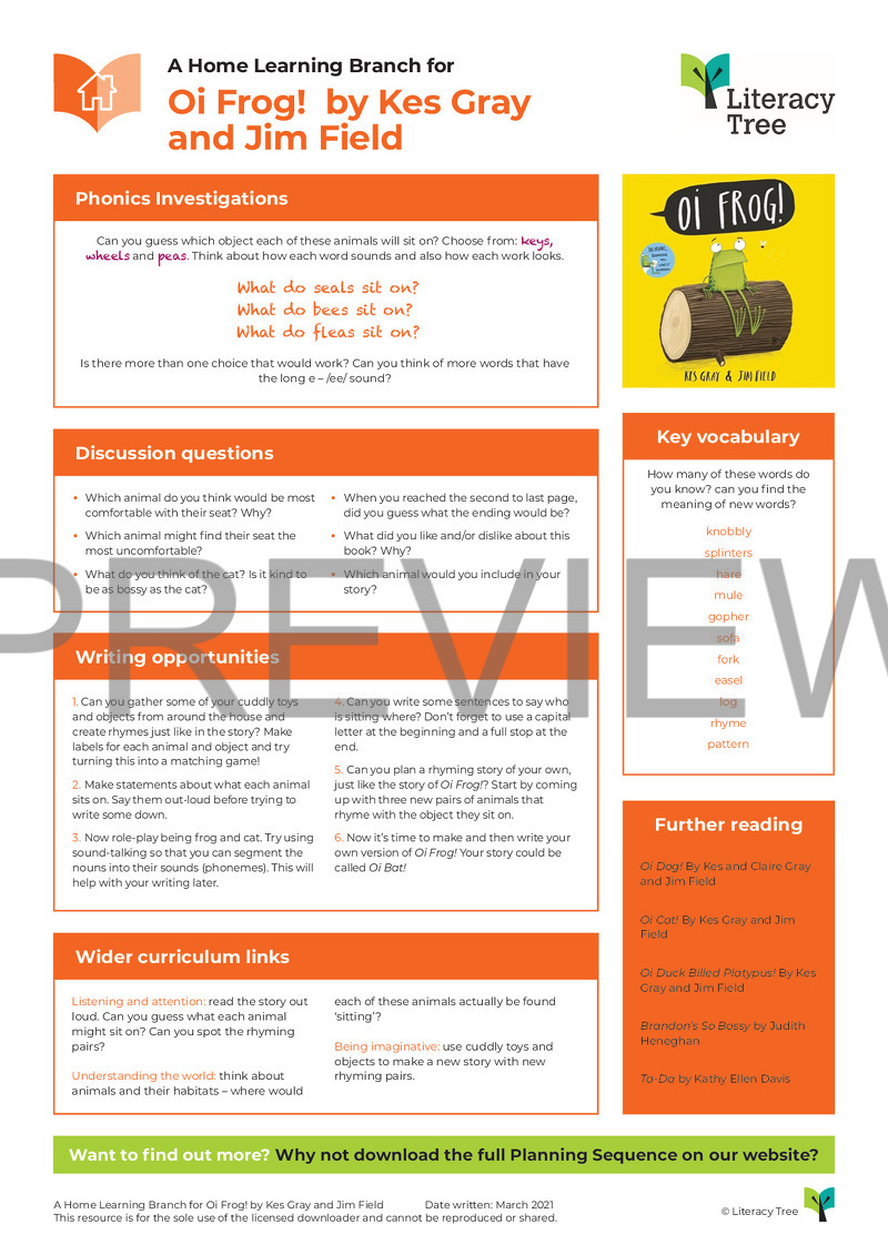 This is a Home Learning Branch for Oi Frog. These branches are designed to support home learners to access literature-based learning using a selection of books we love from Writing Roots. They include purposeful writing suggestions, links to the wider curriculum so that texts can be used across other subjects, key questions as well as spelling or phonics investigations.