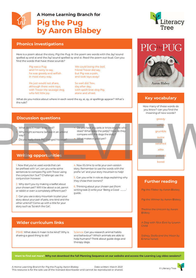 This is a Home Learning Branch for Pig the Pug. These branches are designed to support home learners to access literature-based learning using a selection of books we love from Writing Roots. They include purposeful writing suggestions, links to the wider curriculum so that texts can be used across other subjects, key questions as well as spelling or phonics investigations.