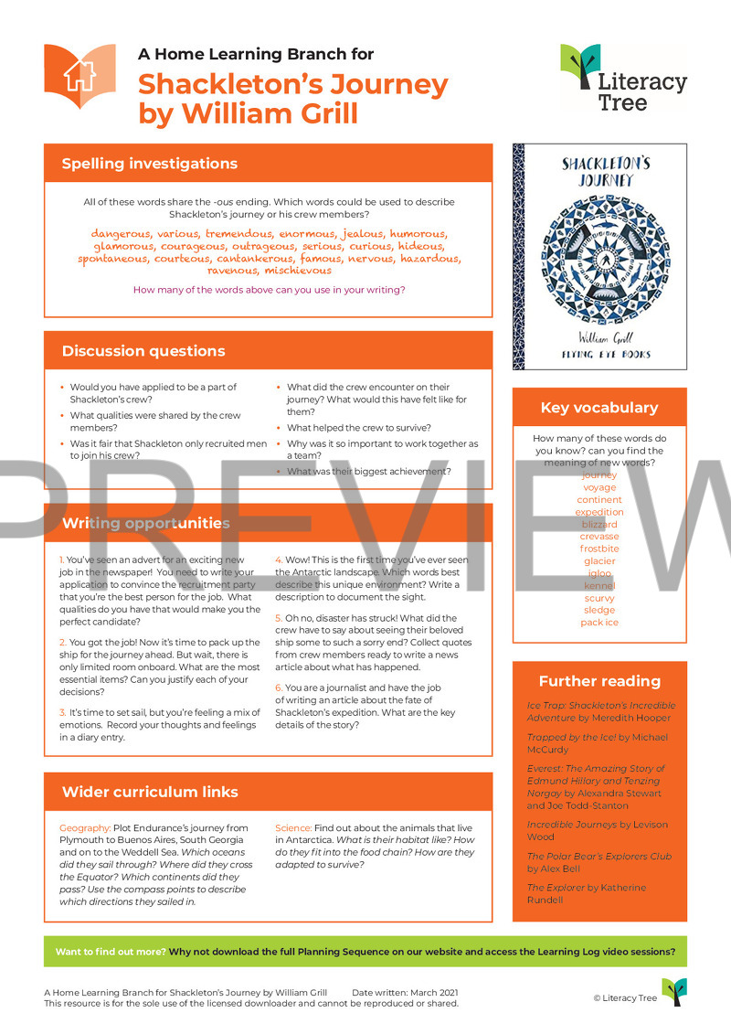 This is a Home Learning Branch for Shackleton's Journey. These branches are designed to support home learners to access literature-based learning using a selection of books we love from Writing Roots. They include purposeful writing suggestions, links to the wider curriculum so that texts can be used across other subjects, key questions as well as spelling or phonics investigations.