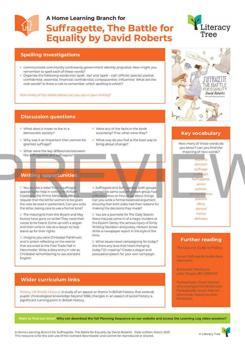 This is a Home Learning Branch for Suffragette: The Battle for Equality. These branches are designed to support home learners to access literature-based learning using a selection of books we love from Writing Roots. They include purposeful writing suggestions, links to the wider curriculum so that texts can be used across other subjects, key questions as well as spelling or phonics investigations.
