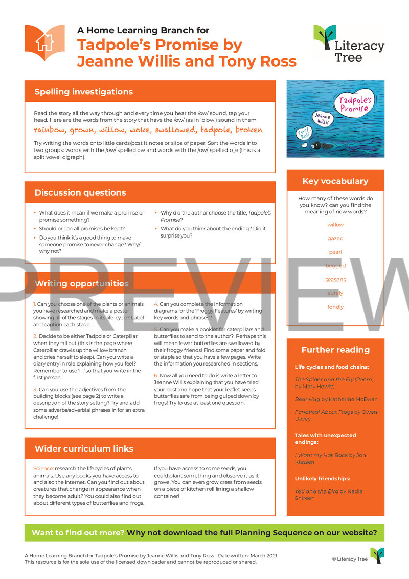 This is a Home Learning Branch for Tadpole's Promise. These branches are designed to support home learners to access literature-based learning using a selection of books we love from Writing Roots. They include purposeful writing suggestions, links to the wider curriculum so that texts can be used across other subjects, key questions as well as spelling or phonics investigations.