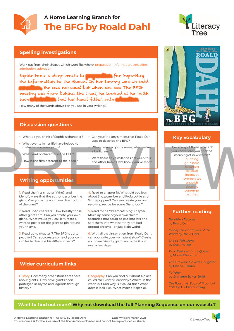 This is a Home Learning Branch for The BFG. These branches are designed to support home learners to access literature-based learning using a selection of books we love from Writing Roots. They include purposeful writing suggestions, links to the wider curriculum so that texts can be used across other subjects, key questions as well as spelling or phonics investigations.
