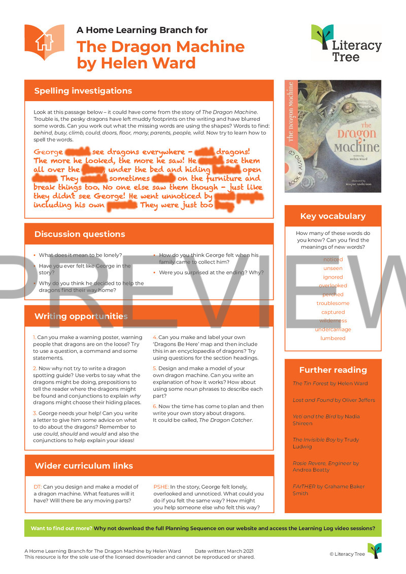 This is a Home Learning Branch for The Dragon Machine. These branches are designed to support home learners to access literature-based learning using a selection of books we love from Writing Roots. They include purposeful writing suggestions, links to the wider curriculum so that texts can be used across other subjects, key questions as well as spelling or phonics investigations.