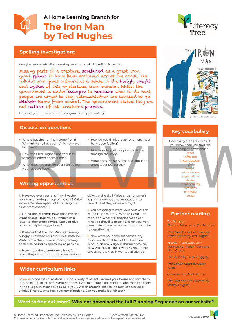 This is a Home Learning Branch for The Iron Man. These branches are designed to support home learners to access literature-based learning using a selection of books we love from Writing Roots. They include purposeful writing suggestions, links to the wider curriculum so that texts can be used across other subjects, key questions as well as spelling or phonics investigations.