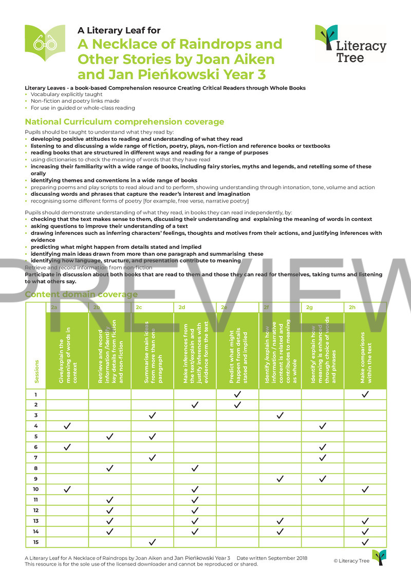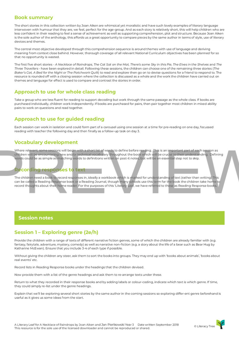 This is a 15-session Literary Leaf for A Necklace of Raindrops by Joan Aiken in which children begin by identifying the genre before going on to make plausible predictions to support finding a theme. Through the stories the children will be introduced to the skill of summarising and will look at words in context to identify meanings in detail.