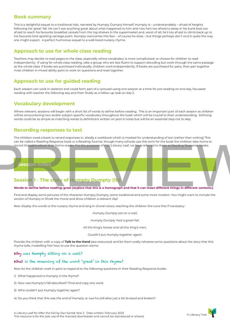 This is a 15-session Literary Leaf for After the Fall by Dan Santat, covering all aspects of the Key Stage 1 content domain. We thought it perfect for a Literary Leaf because of the opportunity to make comparisons between this compelling sequel and the original nursery rhyme. Children will return to the original and consider what happened next - did he get up? Or was that the end? Following Humpty on his quest to regain his confidence and overcome his newly developed fear of heights, children will explore the author's use of vocabulary to retrieve and infer, sequence events in order and analyse the illustrator's use of colour to tell parts of the story. The leaf culminates in children expressing their likes, dislikes, puzzles and connections about the text before creating an advertisement to publicise it to others.