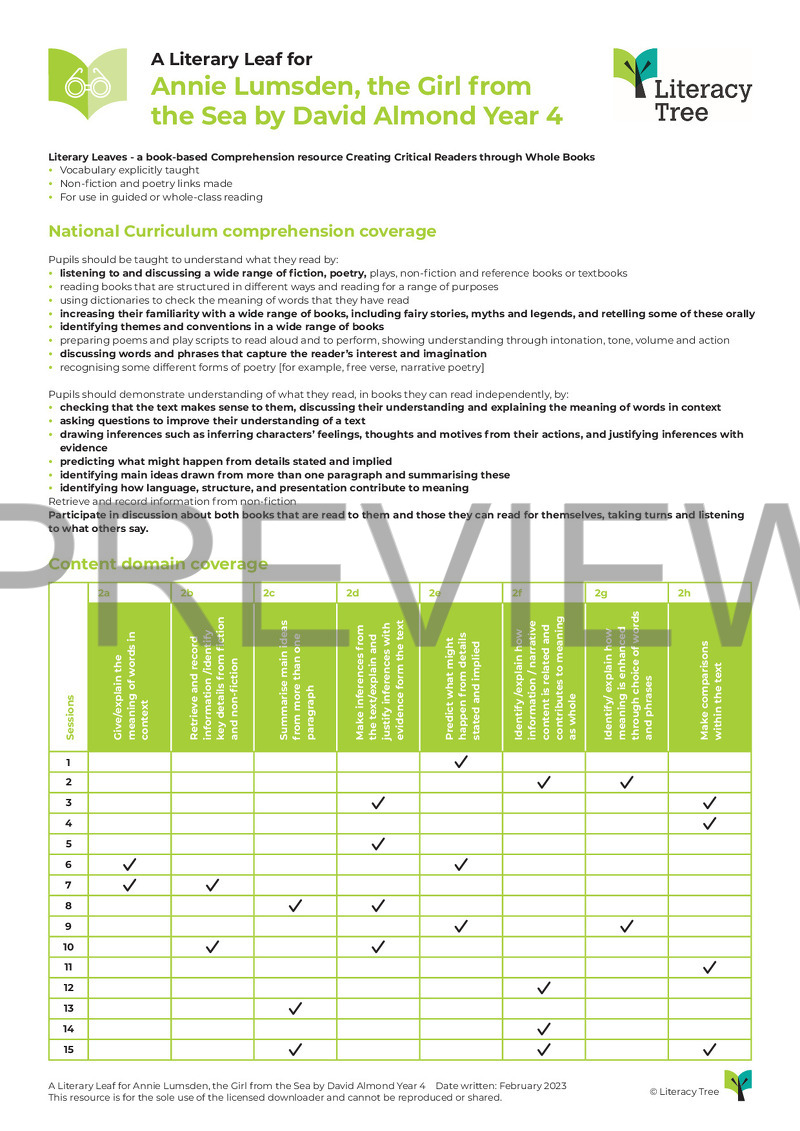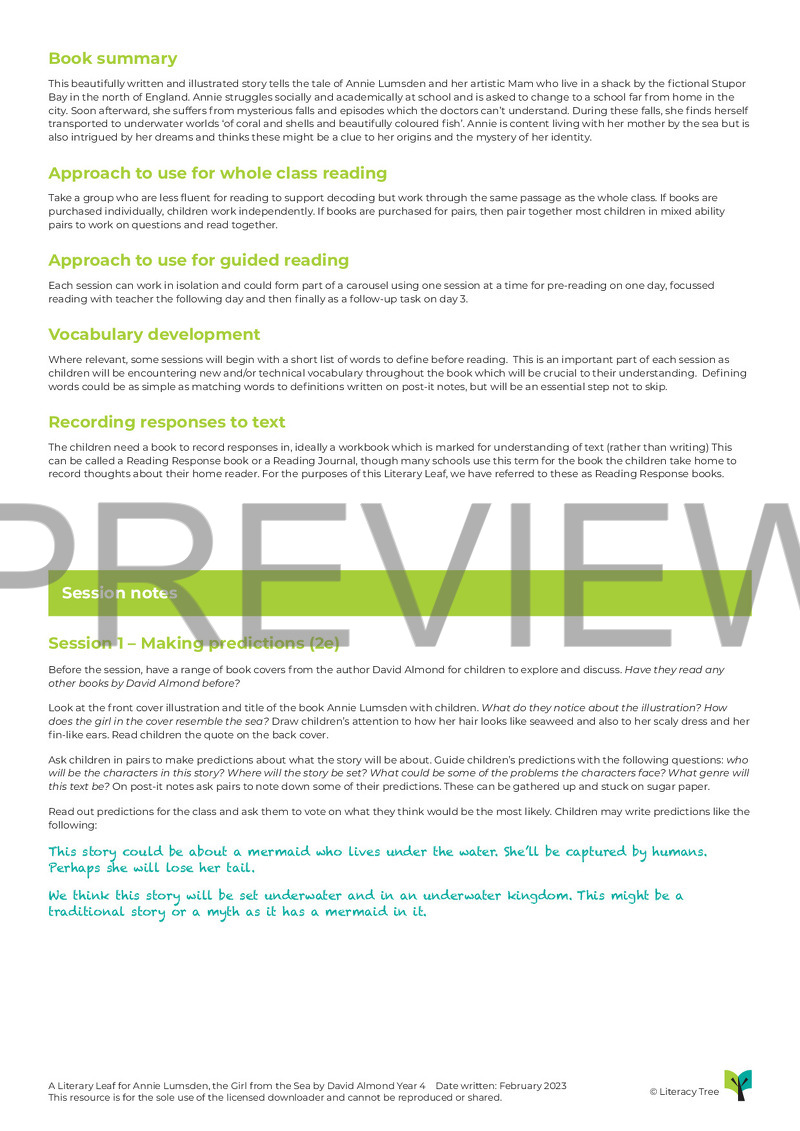 This is a 15-session Literary Leaf for Annie Lumsden, the Girl from the Sea by David Almond, covering all aspects of the Key Stage 2 content domain. Children will explore Annie's watery world and follow the characters on their journey of discovery, beginnings and belonging. Along the way they will analyse the motivations for the characters' decisions and track how their behaviour changes over time. Children will study the language choices made by the author, make predictions, explain their impressions and summarise the story by writing imagined chapter headings. There are also opportunities to study the work of illustrator Beatrice Alemagna and write book reviews so that children can share their thoughts about the story with others.