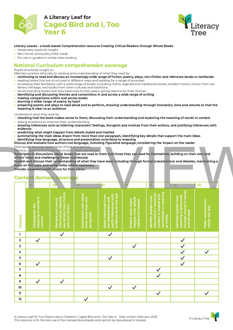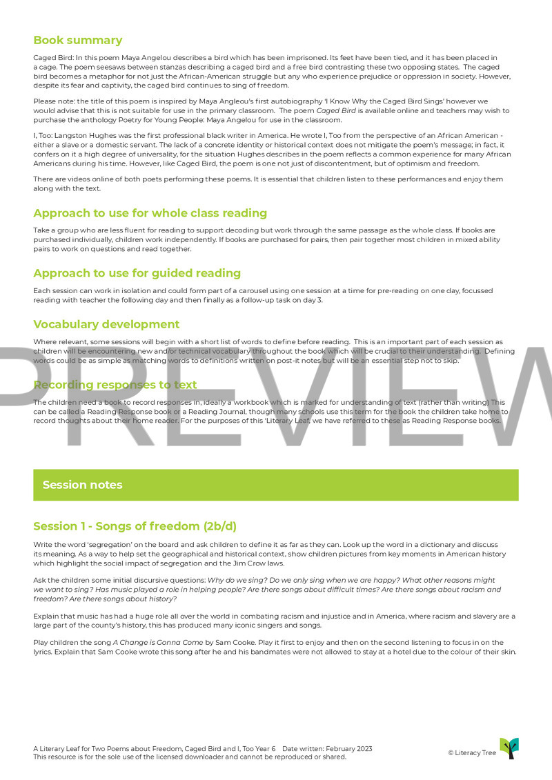 This is a 12-session Literary Leaf for two poems about freedom - Caged Bird by Maya Angelou and I, Too by Langston Hughes. Children will identify the poetic and figurative language used throughout both poems and discuss the motivations of the poets in writing the poems and the impressions created for the reader. They go on to compare and contrast the language and the themes presented in both poems and also perform both with a partner.