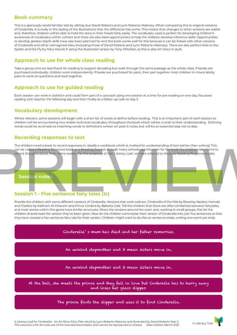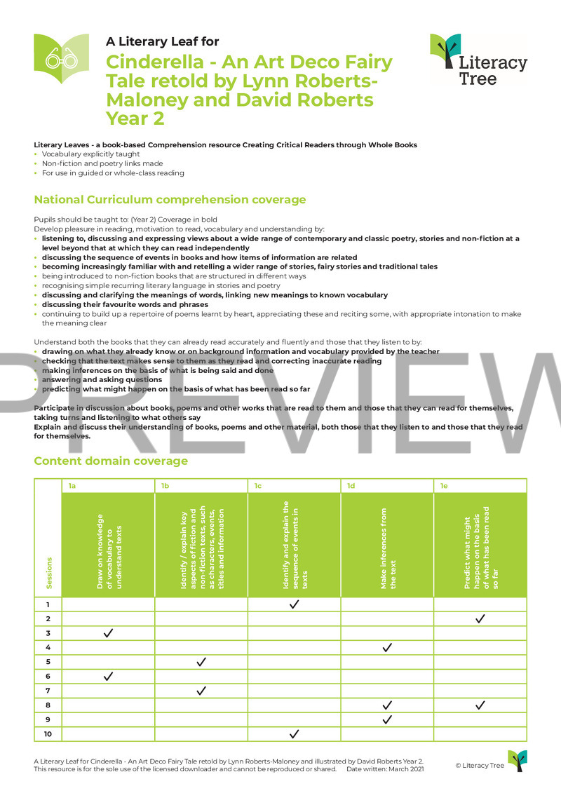 This is a 10-session Literary Leaf for Cinderella: An Art Deco Fairy Tale by Lynn Roberts-Maloney and David Roberts which covers all aspects of the Key Stage 1 content domains. Children will begin by considering a range of versions of this classic fairy tale and identifying the similarities and differences between them. Armed with a solid understanding of the story, they will move on to making predictions for this version, as well as drawing inferences about the characters and summarising sections of the story. The series of lessons finishes by exploring the themes covered and children will be encouraged to identify evidence to support and justify their opinions. There will also be opportunities to explore the meanings of new vocabulary in context.