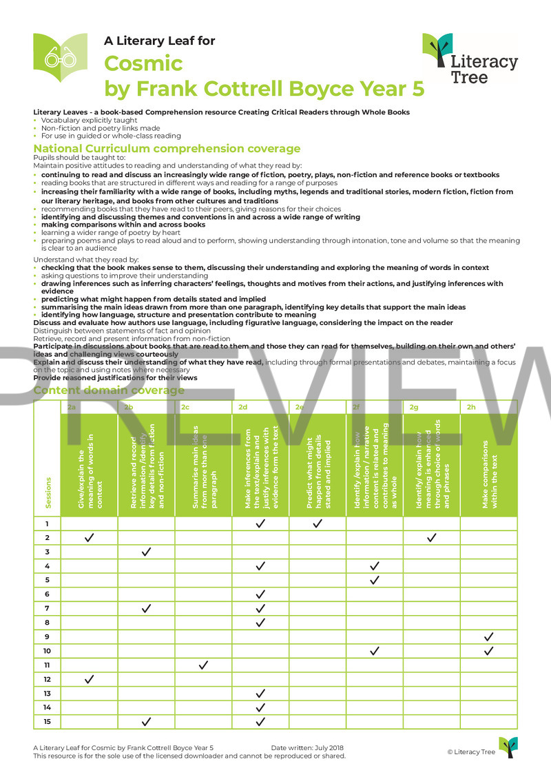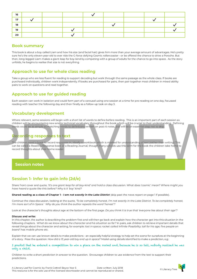 This is a 15-session Literary Leaf for Cosmic by Frank Cottrell-Boyce. Children begin by exploring the vocabulary used and, as the book has short chapters (with some rather brilliant titles), they are immersed very quickly into the seemingly implausible plot. There are many opportunities to retrieve information as well as infer, looking in particular at the character of Liam and how he acts when tasked with having to literally 'man up'.