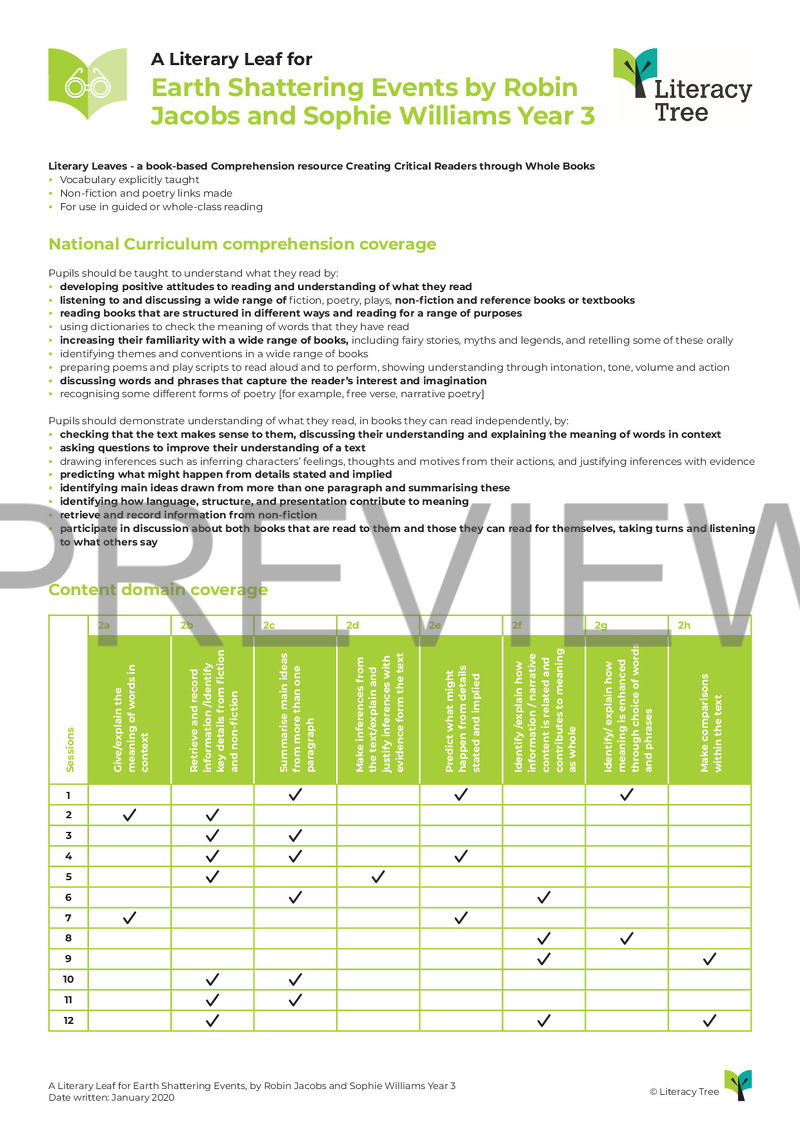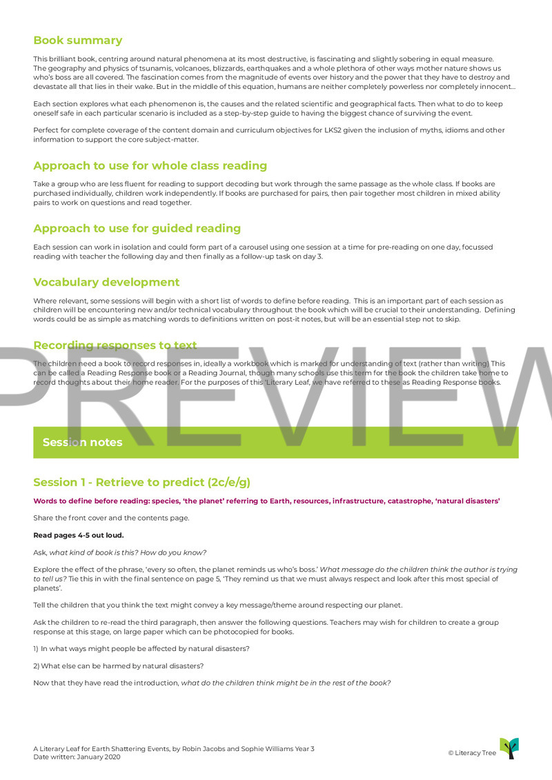This is a 12-session Literary Leaf for Earth Shattering Events by Robin Jacobs and Sophie Williams which looks specifically at the vocabulary associated with natural disasters. The book is perfect for complete coverage of the content domain and curriculum objectives for LKS2 given the inclusion of myths, idioms and other information to support the core subject-matter. Children will be able to match information and sequence events.