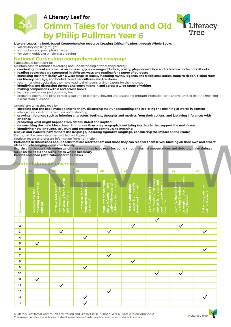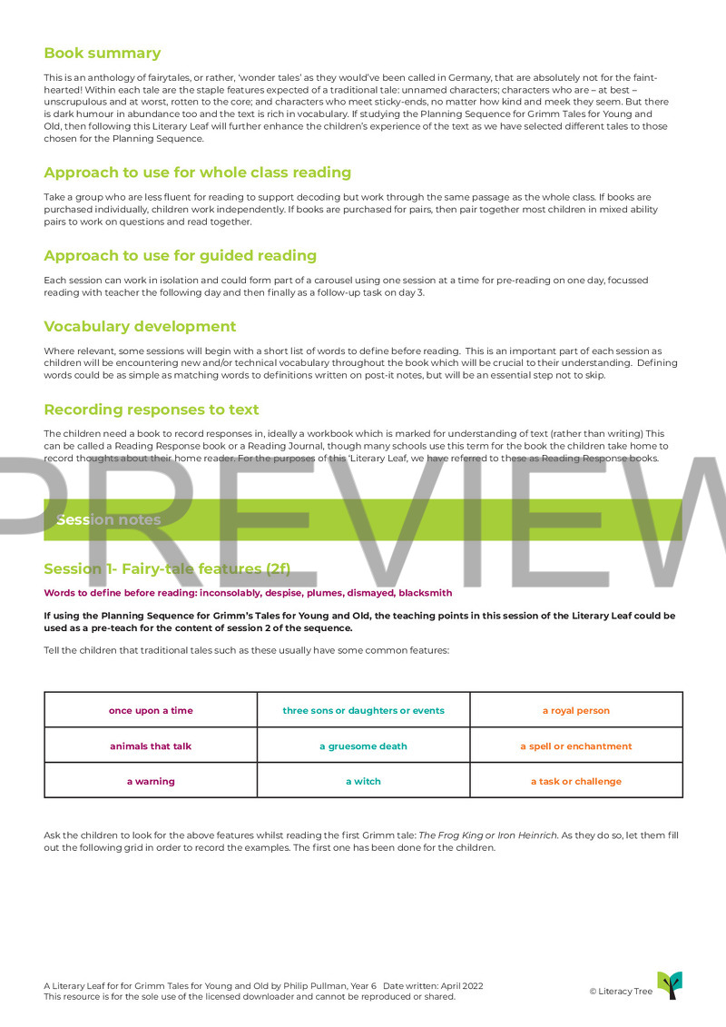 This is a 15 session Literary Leaf using Grimm Tales for Young and Old by Philip Pullman. The resource can be used alongside the Planning Sequence for the text of the same name but we have selected different tales for this resource and so it could easily be used in isolation. Complete coverage of the reading comprehension curriculum for upper key stage two is planned for with vocabulary being explicitly taught at the beginning of each session. In particular children will develop understanding of literary/idiomatic language; themes and conventions of traditional tales/fairytales and authorial devices such as repetition and humour. The resource culminates in an opportunity to nominate within eight categories, vote for and then hold an award ceremony for the ‘Grimms’… Oscar-style awards, but specifically for these tales!
