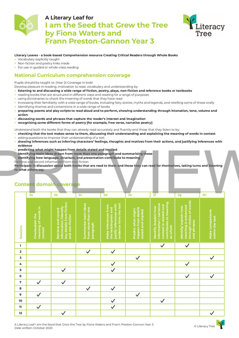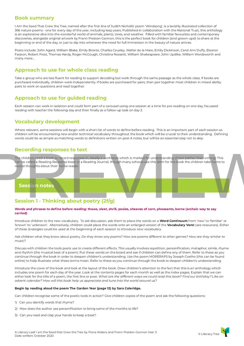 This is a 12 session Literary Leaf for I Am the Seed That Grew the Tree: A Nature Poem for Every Day of the Year by Fiona Waters and Frann Preston-Gannon which covers all aspects of the Lower Key Stage 2 content domain. Within this sequence, children will explore poetic language and terminology and have the opportunity to explore the different seasons through each of the sessions as well as listening to music to evoke atmosphrere.