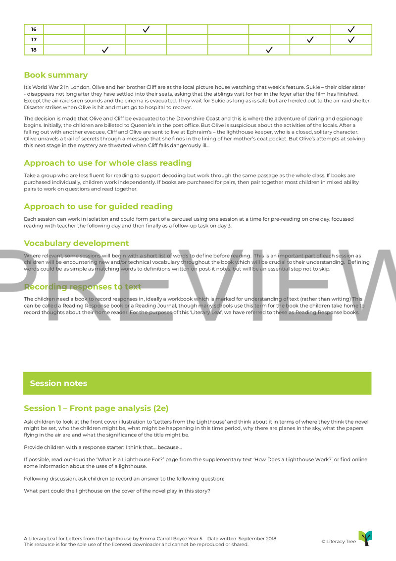 This is an 18-session Literary Leaf for Letters from the Lighthouse by Emma Carroll in which children begin by using a supplementary text (if available) called 'How Does a Lighthouse Work?' by Roman Belyaev to extract some facts before delving into the text and making inferences and comparisons about characters.