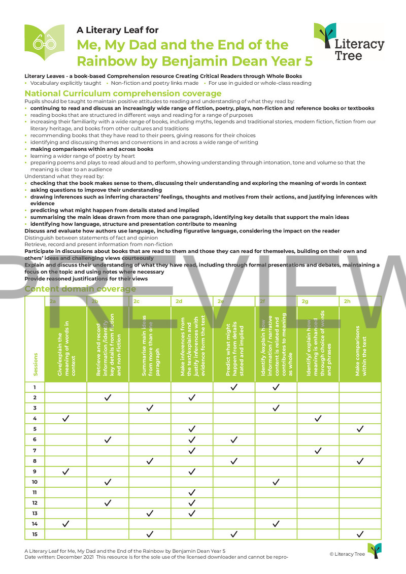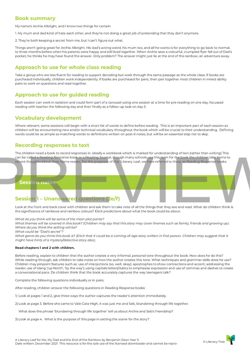 This is a 15 session Literary Leaf for Me, My Dad and the End of the Rainbow and covers all aspects of the Key Stage 2 content domain. Archie’s family are going through a challenging time and we follow Archie, who enlists the help of his loyal friends, as he tries to make his family happy again. Amongst other things, this Literary Leaf focusses on looking for clues in the text to support inferences as well as summarising events and dialogue succinctly.