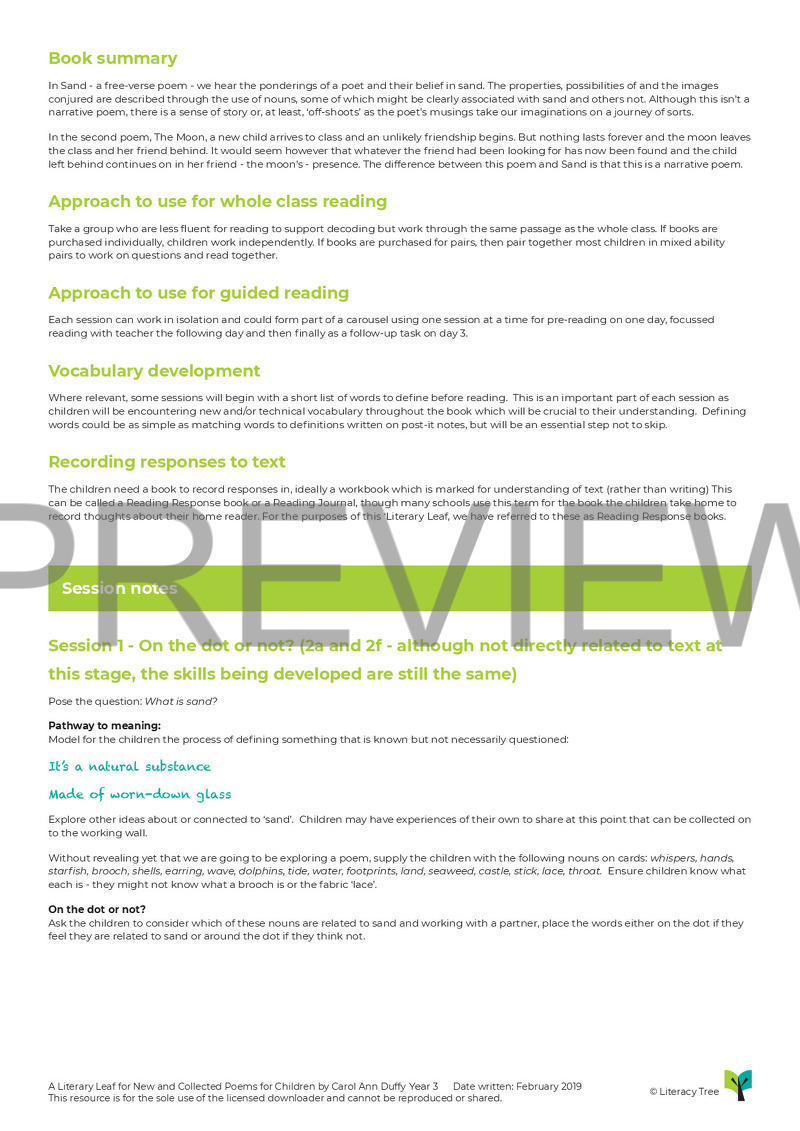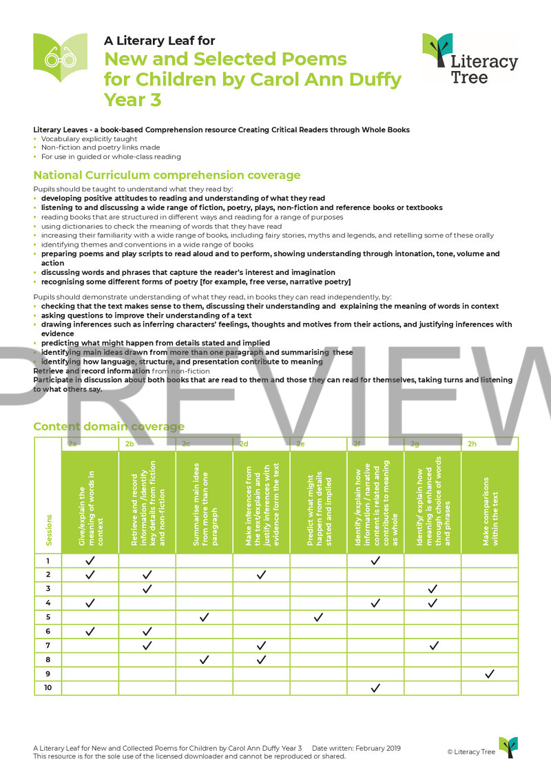 This is a 10 session Literary Leaf for New and Collected Poems in which children begin by identifying some of the poetic language to help them understand the poems' structure. Through closely looking at two poems the children will be introduced to the skill of summarising and will look at language within the poems to see how the poet creates a picture. Children will compare both poems through content and form and finally pick their own poem to perform to the class.