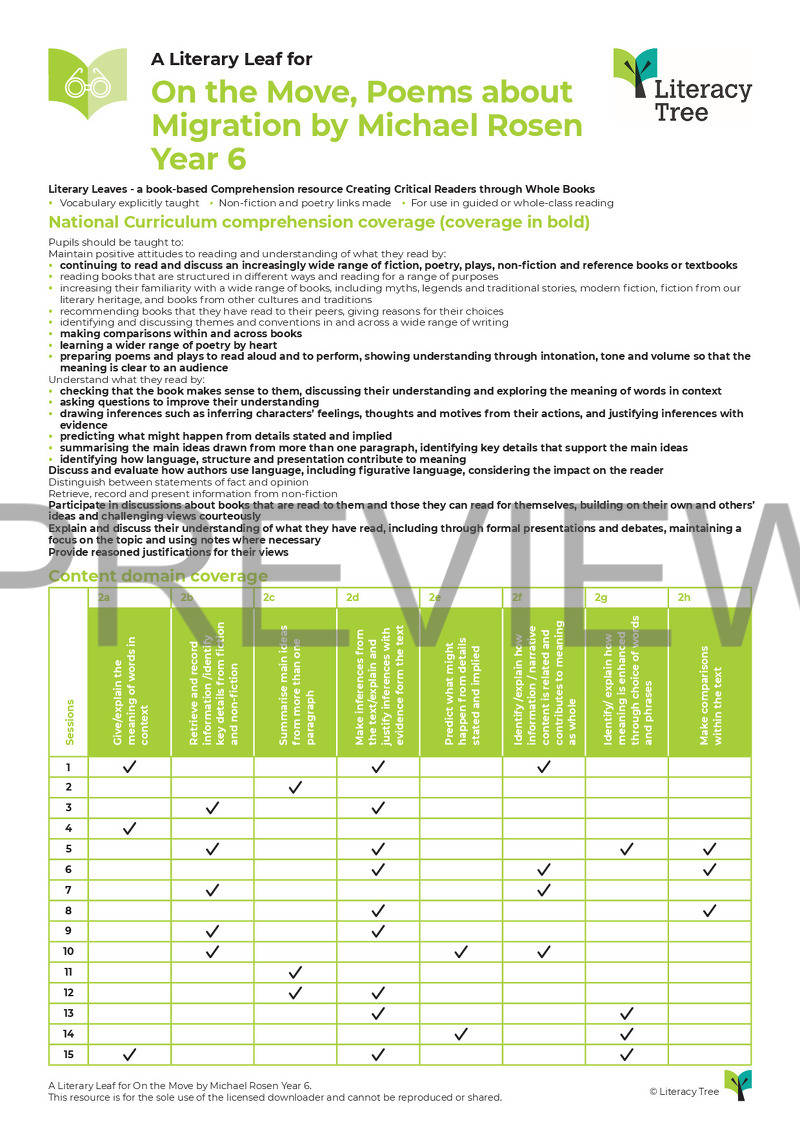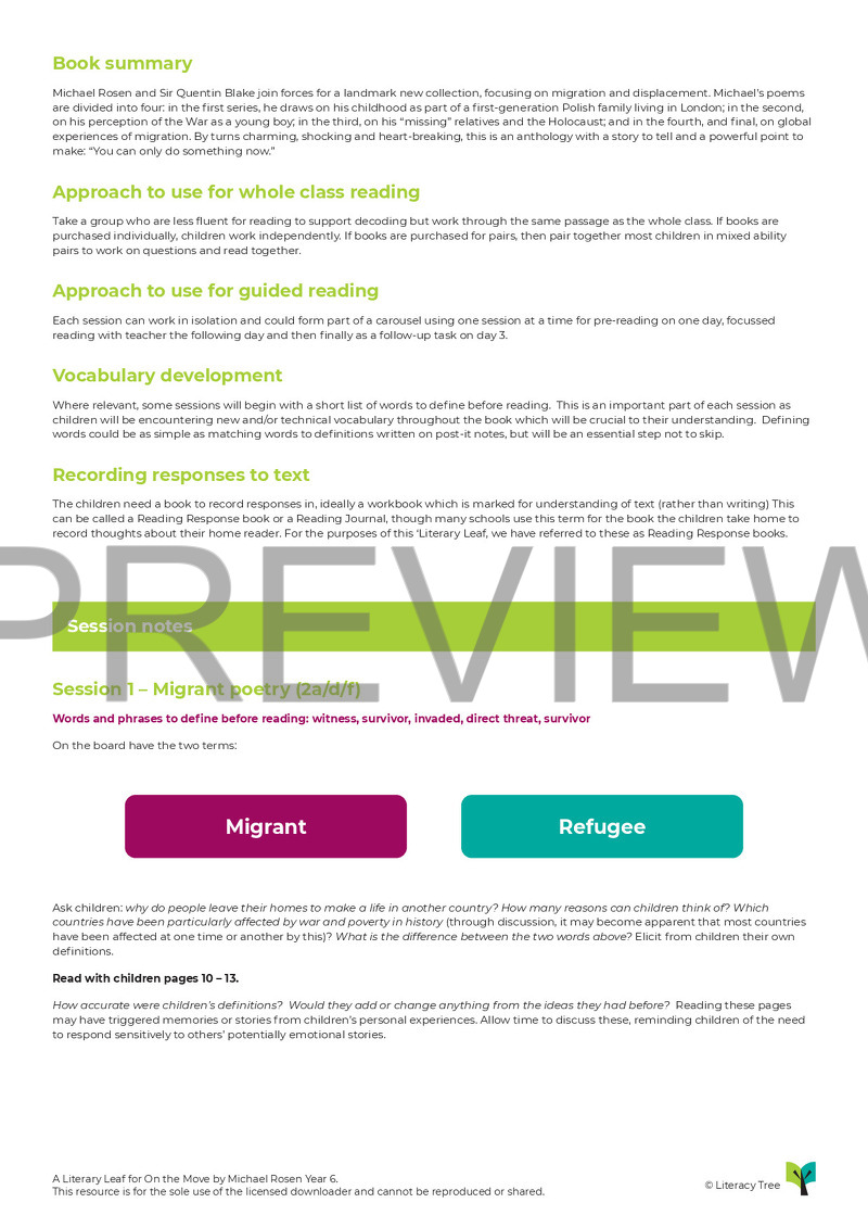 This is a 15-session Literary Leaf for On the Move by Michael Rosen and illustrated by Quentin Blake. This Literary Leaf covers all aspects of the Key Stage 2 content domain. Children will read a range of poems from this vibrant, humorous and moving collection. They will be encouraged to perform these poems in different ways, incorporating different dramatic techniques. Children will explore questions around word meaning and word choice as well as analyse different aspects of the poet’s craft. As they read through this collection, they will discuss a range of themes such as migration, belonging, memory and family. This collection also allows children to discuss history, including the Jewish experience of the Second World War.
