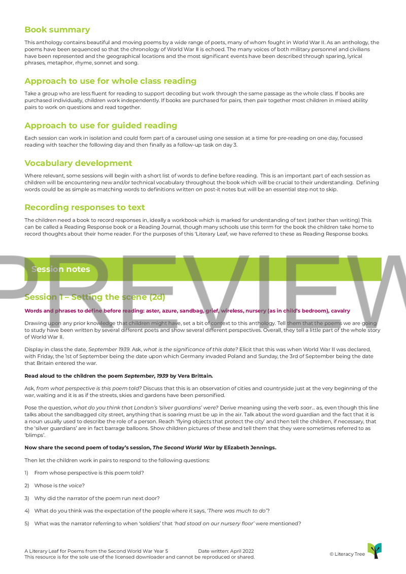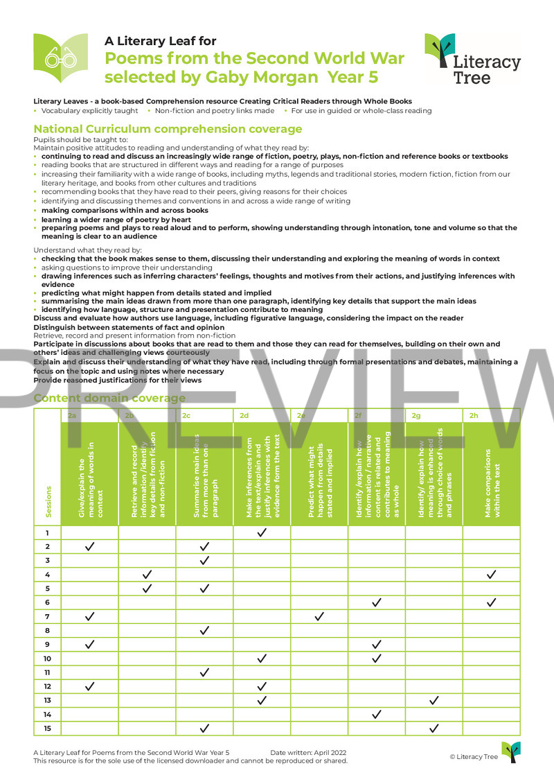 This is 15-session Literary Leaf using Poems from the Second World War, selected by Gaby Morgan. Complete coverage of the content domain for reading at key stage two has been covered, with vocabulary being explicitly taught at the beginning of each session. In particular, skills of retrieval, inference, prediction and summarising are developed, with children being supported to apply these skills across several poems. Through the use of this resource, children will explore the many voices represented through the poems and have the opportunity in the final session to choose their own favourite poem, identifying emotive phrases and writing a blurb.