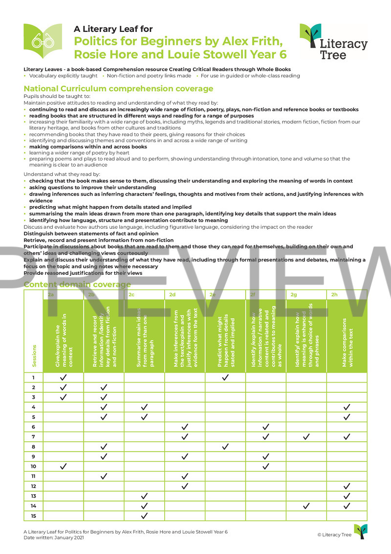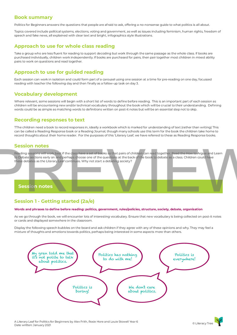 This is a 15-session Literary Leaf for Usborne Politics for Beginners by Alex Frith, Rosie Hore and Louie Stowell. This Literary Leaf covers all aspects of the Key Stage 2 content domain and offers many rich opportunities for children to learn and discuss various political concepts. The book itself combines effective text and illustrations in a straightforward, eye-catching way that makes this subject accessible, fun and extremely relevant for children. The Literary Leaf begins with children articulating their own opinions and feelings about politics. They will go on to learn about different political ideologies and parties, civil society and levels of governance – local, national and international – all the while building their vocabulary, learning how to debate using evidence and refining their own critical thinking.