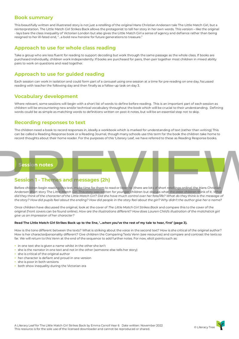 This is a 15-session Literary Leaf for The Little Match Girl Strikes Back which covers all aspects of the Upper Key Stage 2 content domains. Throughout the sequence children will get to know the characters through making inferences based on their behaviours and motivations. Children will study the language used by the author to portray differences in the ways factory workers and street sellers were treated in comparison to the more privileged classes. There will also be opportunities to compare the original text by Hans Christian Andersen to this newly-imagined version and children will be encouraged to take part in whole class discussions and debates around the topics covered and the links to other historical contexts.