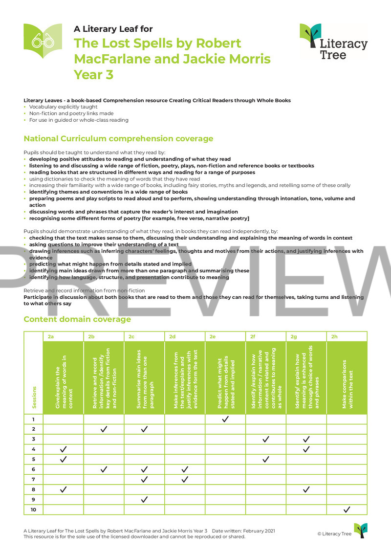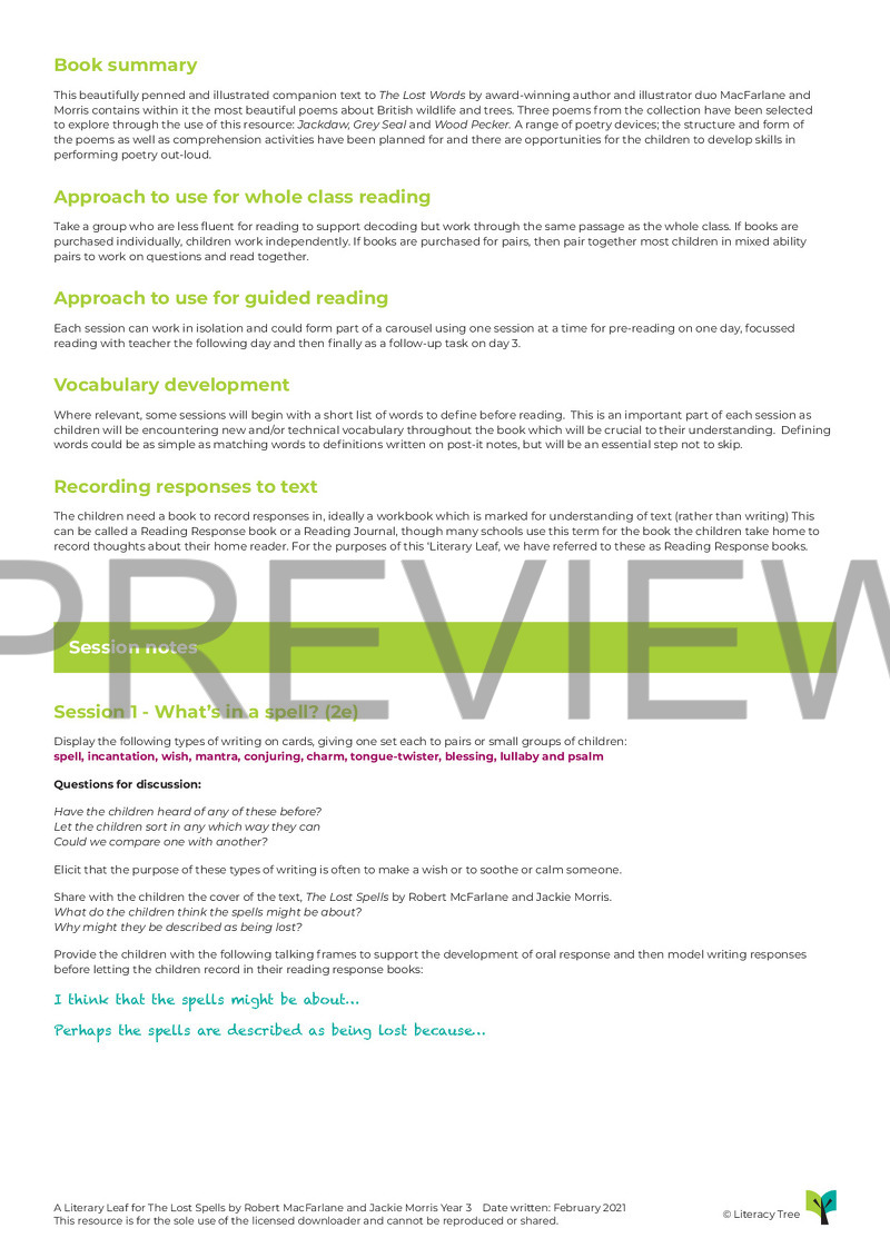 This is a 10-session Literary Leaf for The Lost Spells by Robert Macfarlane and Jackie Morris which covers all aspects of the Lower Key Stage 2 content domains. Children will study three poems from the collection in particular: Jackdaw, Grey Seal and Woodpecker. Children begin by exploring the notion of 'spells' and make predictions about what the Lost Spells may be about. They then move on to study each poem in turn, investigating the vocabulary and meanings within each and examining the authors' use of poetic devices. Through studying three poems side by side, children are encouraged to make comparisons by summarising and identifying similarities between each. There will also be opportunities for children to work in small groups to discuss and share thoughts about their reading.