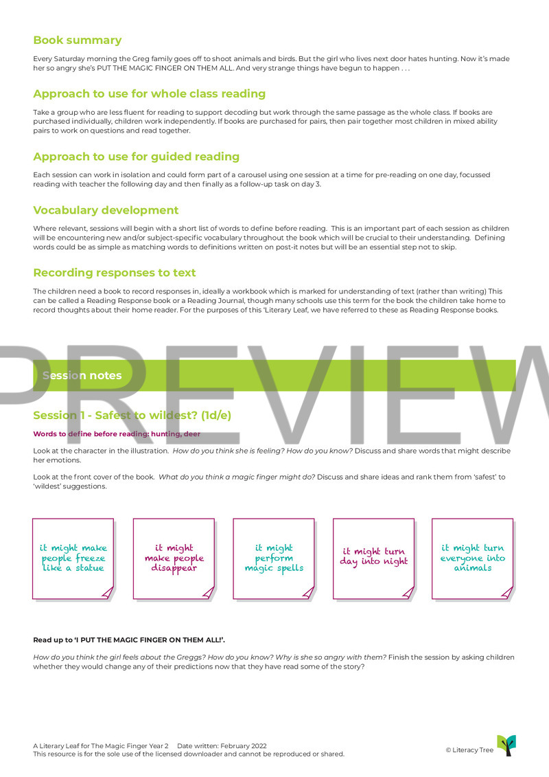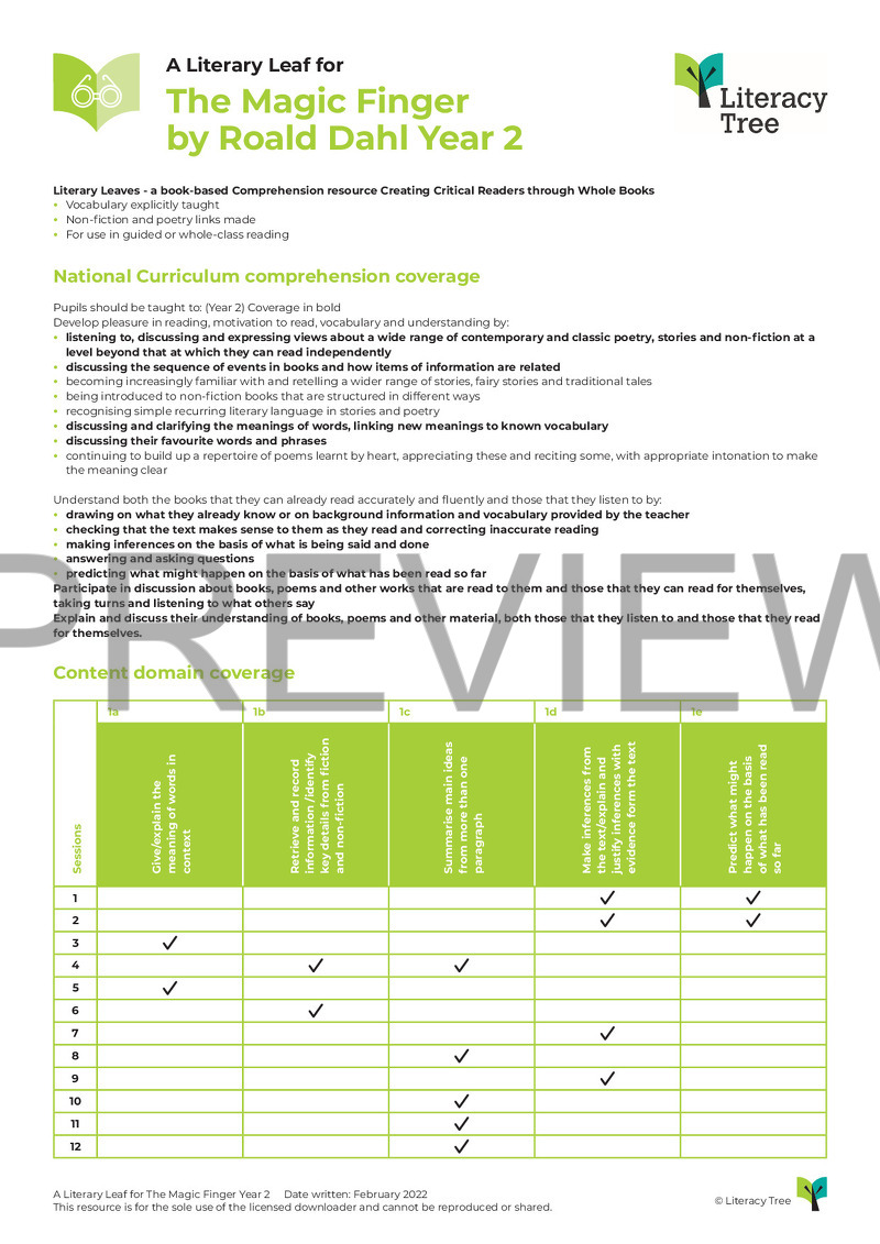 This is a 12-session Literary Leaf for The Magic Finger by Roald Dahl which begins by making predictions about the book including what the magic finger might do. The leaf goes on to explore the characters of the Greggs and how they change and learn from their experiences. It finishes by looking at the character of the girl and thinking about how she uses her magic finger for good - and the children think about what positive change they might make with a magic finger.
