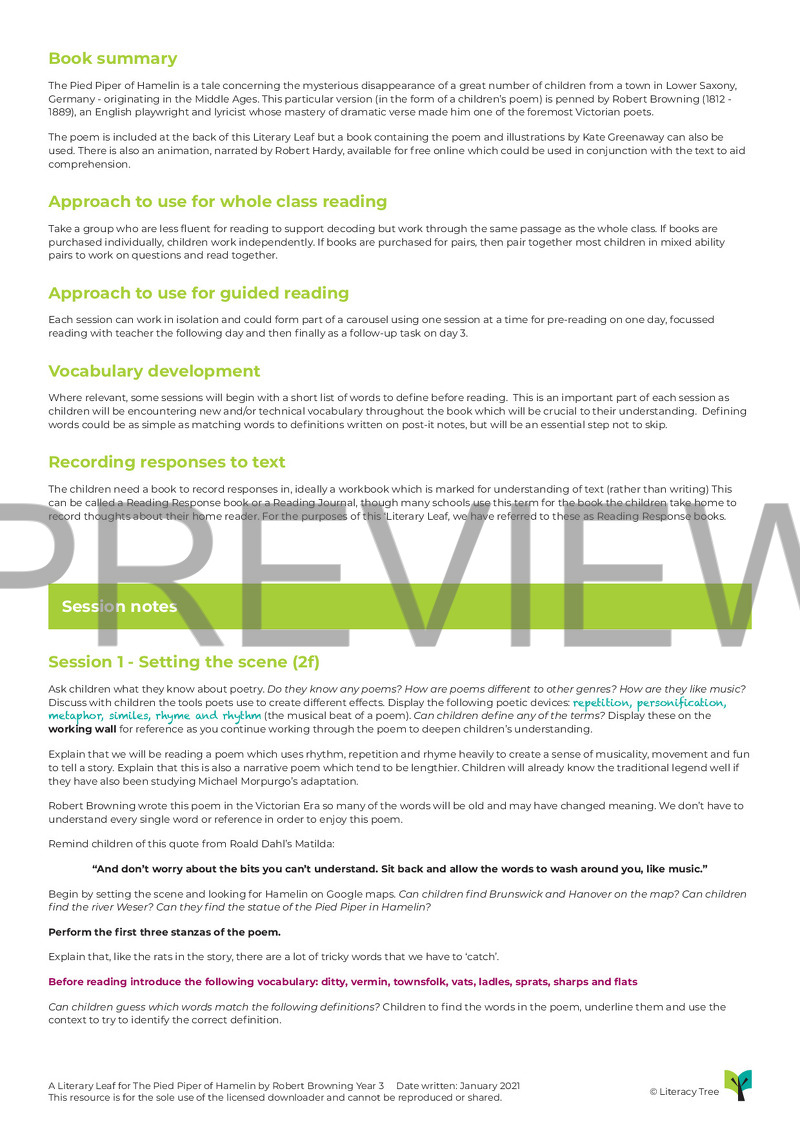 This is an 11-session Literary Leaf for the narrative poem The Pied Piper of Hamelin by Robert Browning through which children explore an alternative version of this well-known story. Written in Old-English, each session will begin with a chance for children to explore new and unfamiliar vocabulary in the context of the poem. Lessons will provide opportunities for children to infer about characters, summarise sections of the poem in their own words and explore the shape of the poem and its rhyming structure. There are also chances for children to consider the moral messages of the story within the poem and, if time, role play characters from the story to express their thoughts and opinions.