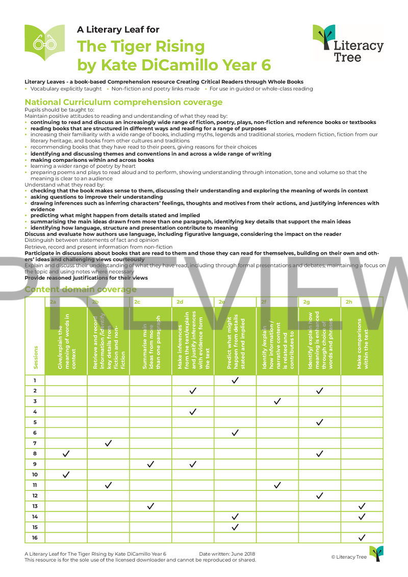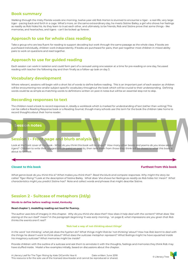 This is a 16-session Literary Leaf for Tiger Rising by Kate DiCamillo and the poem The Tyger by William Blake which children use to compare the language used around tigers. Children explore language - literal and figurative - within the text and explore how to infer deeply around a character's intentions. They plot the main character's journey through exploring his emotions and weigh up decisions he is faced with along the way. The series of lessons ends with children studying the 'shape' of the story and considering the literary themes covered.