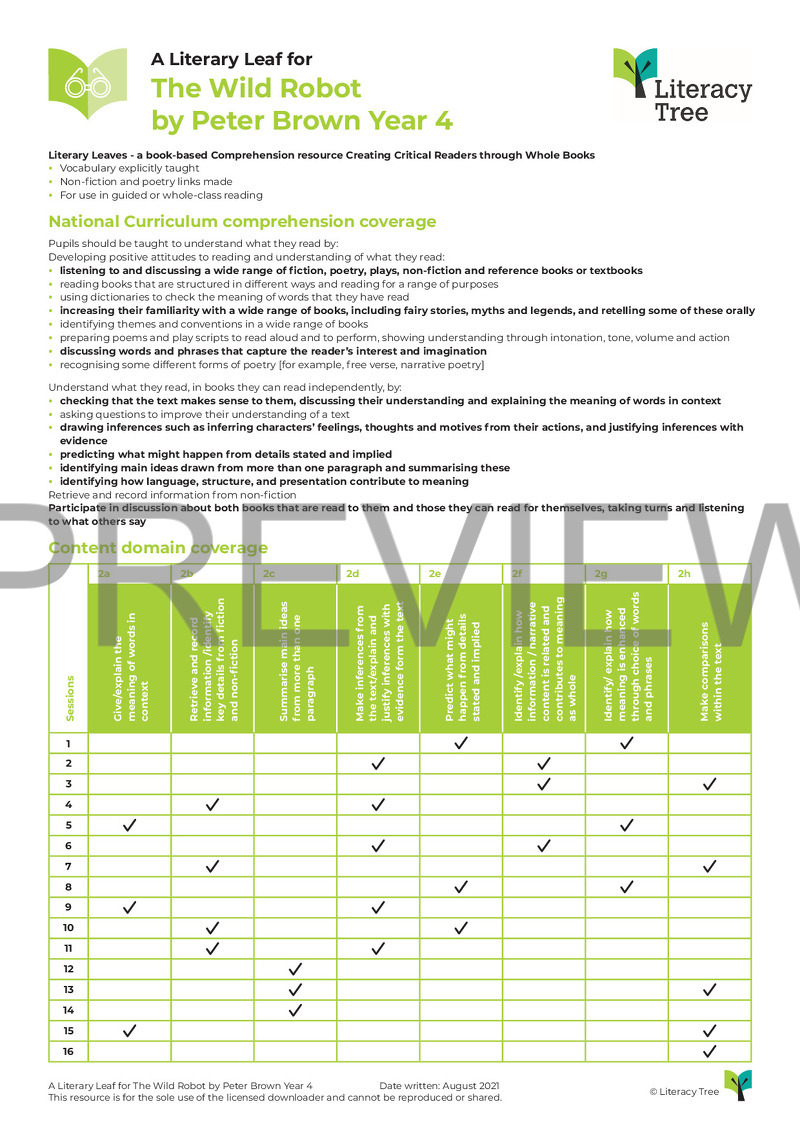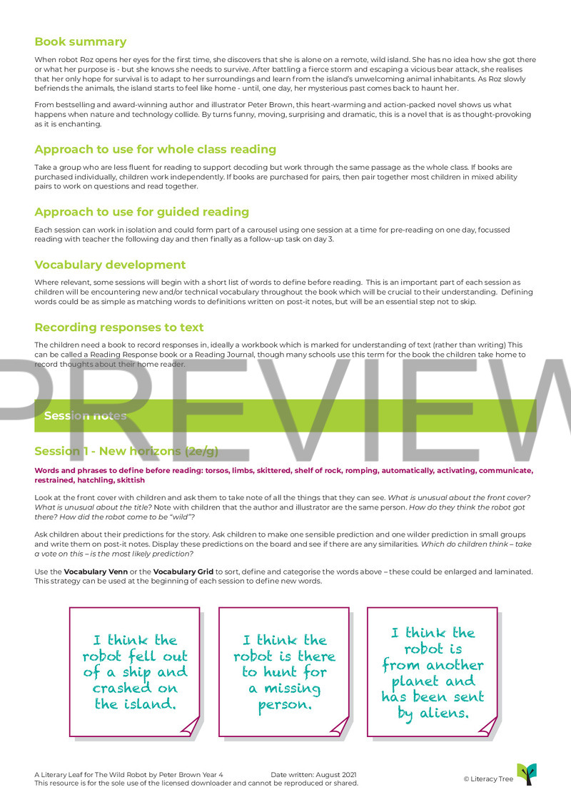 This is a 15-session Literary Leaf for The Wild Robot by Peter Brown, covering all aspects of the Key Stage 2 content domain. Children will follow the journey of the Rozzum Unit 7137 as she learns and develops on a strange, remote and mysterious island. Children will gain experience of answering a range of inference questions, focussing on impressions, character’s feelings, relationships and motivations. They will explore how protagonists change over time by mapping out character arcs and will also gain experience of summarising key plot points.