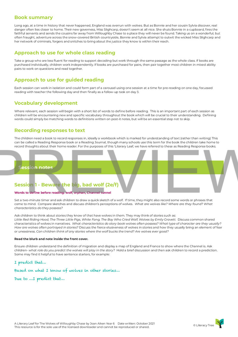 This is a 15-session Literary Leaf for The Wolves of Willoughby Chase by Joan Aiken and covers all aspects of the Key Stage 2 content domains. As a starting point, children will explore the perception of wolves as characters within children’s literature, including their common characteristics, perceptions and portrayals. They will move on to developing their inference skills by identifying emotions and expressing first impressions, as well as summarising changes in characters, settings and atmosphere as the story progresses. Children will have the opportunity to express opinions and explore imagery through visualising the wolves as a perceived threat or invasion.
