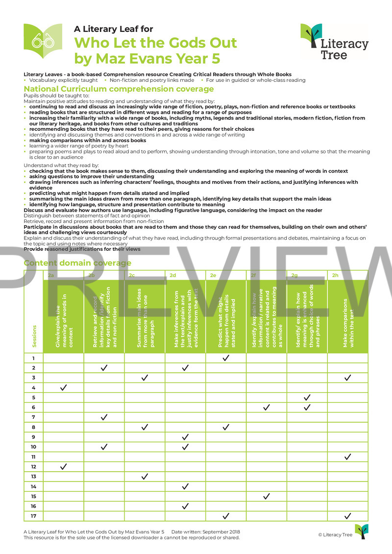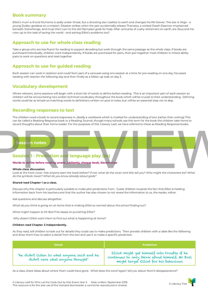 This is a 17-session Literary Leaf for Who Let the Gods Out by Maz Evans which covers all aspects of the Key Stage 2 content domains. Children will begin by making predictions using the front cover, then move on to retrieving information to infer characters' actions and motivations. There will be opportunities for children to explore vocabulary in context and compare characters by summarising. They will work through some specific question stems in detail before creating their own questions and exploring aspects of the author's style. The leaf finishes with children predicting what's next in Maz Evans's Who Let the Gods Out series.