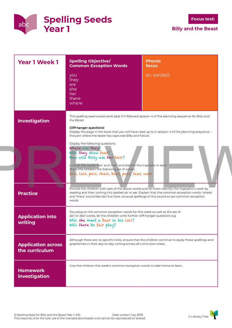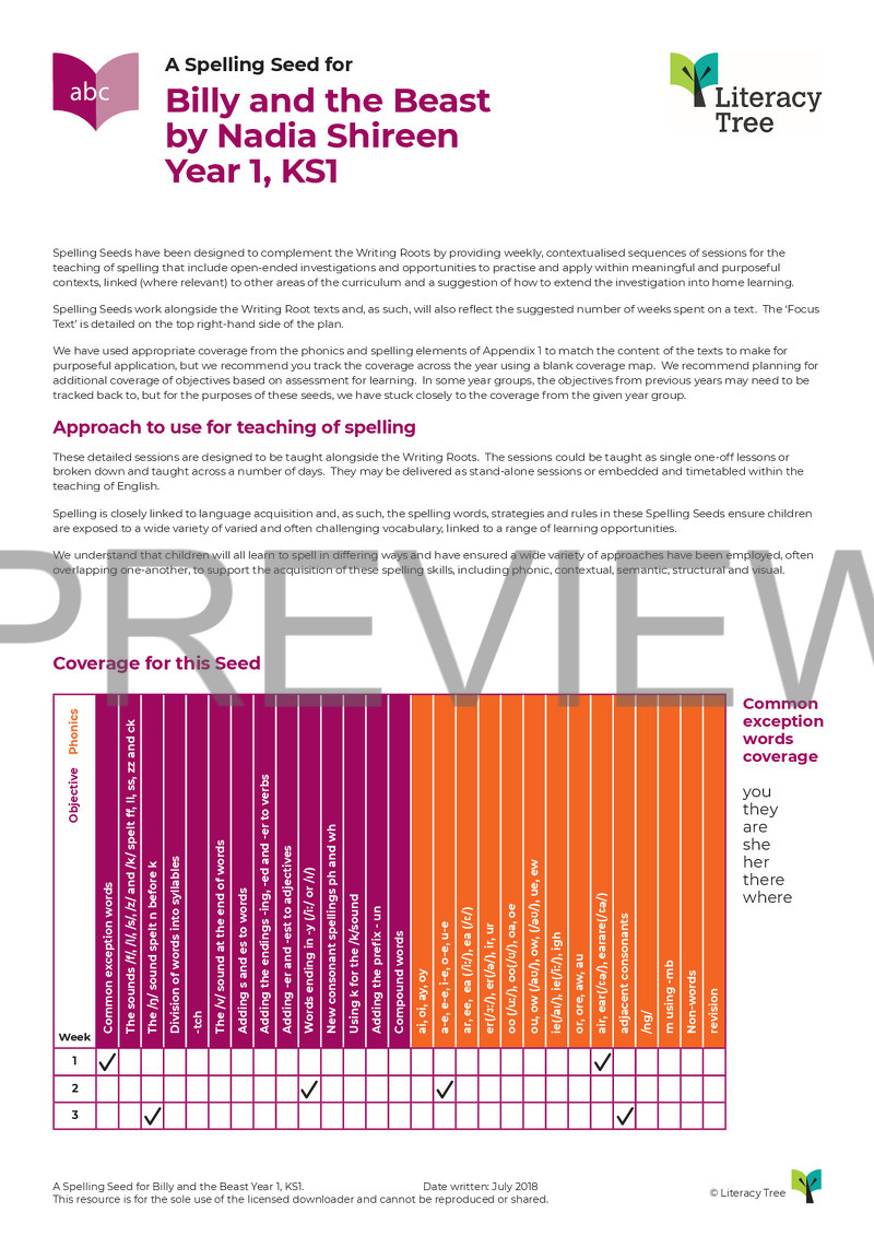 This is a two-session spelling seed for the book Billy and the Beast by Nadia Shireen. Below is the coverage from Appendix 1 of the National Curriculum 2014.