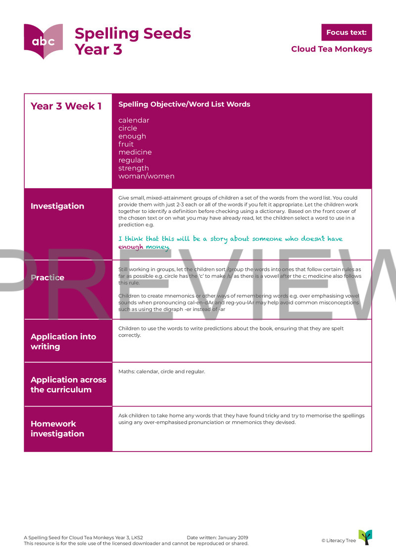This is a three-session spelling seed for the book Cloud Tea Monkeys by Mal Peet. Below is the coverage from Appendix 1 of the National Curriculum 2014.