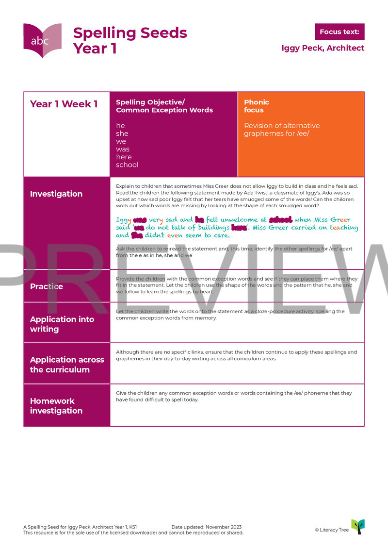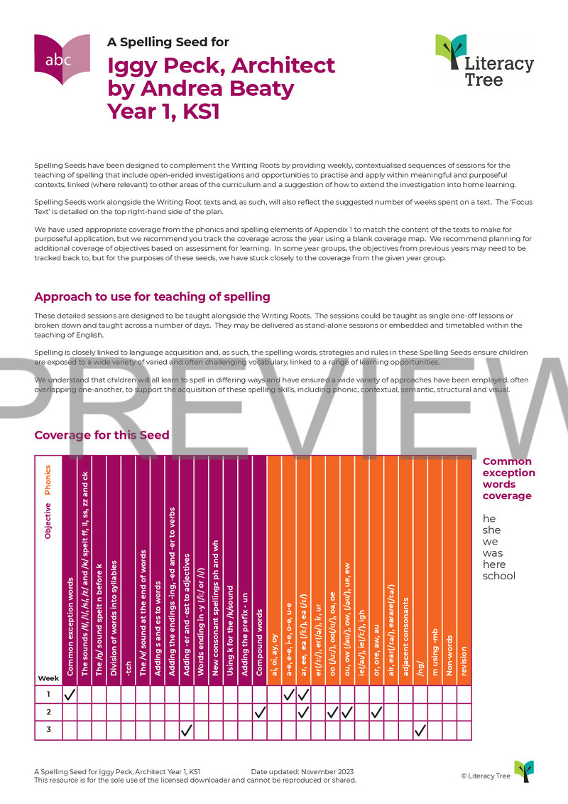 This updated version of the Spelling Seed for Iggy Peck, Architect was produced in November 2023. If you have used the previous version in the past and would like a copy of the resource, please email us at info@literacytree.com.