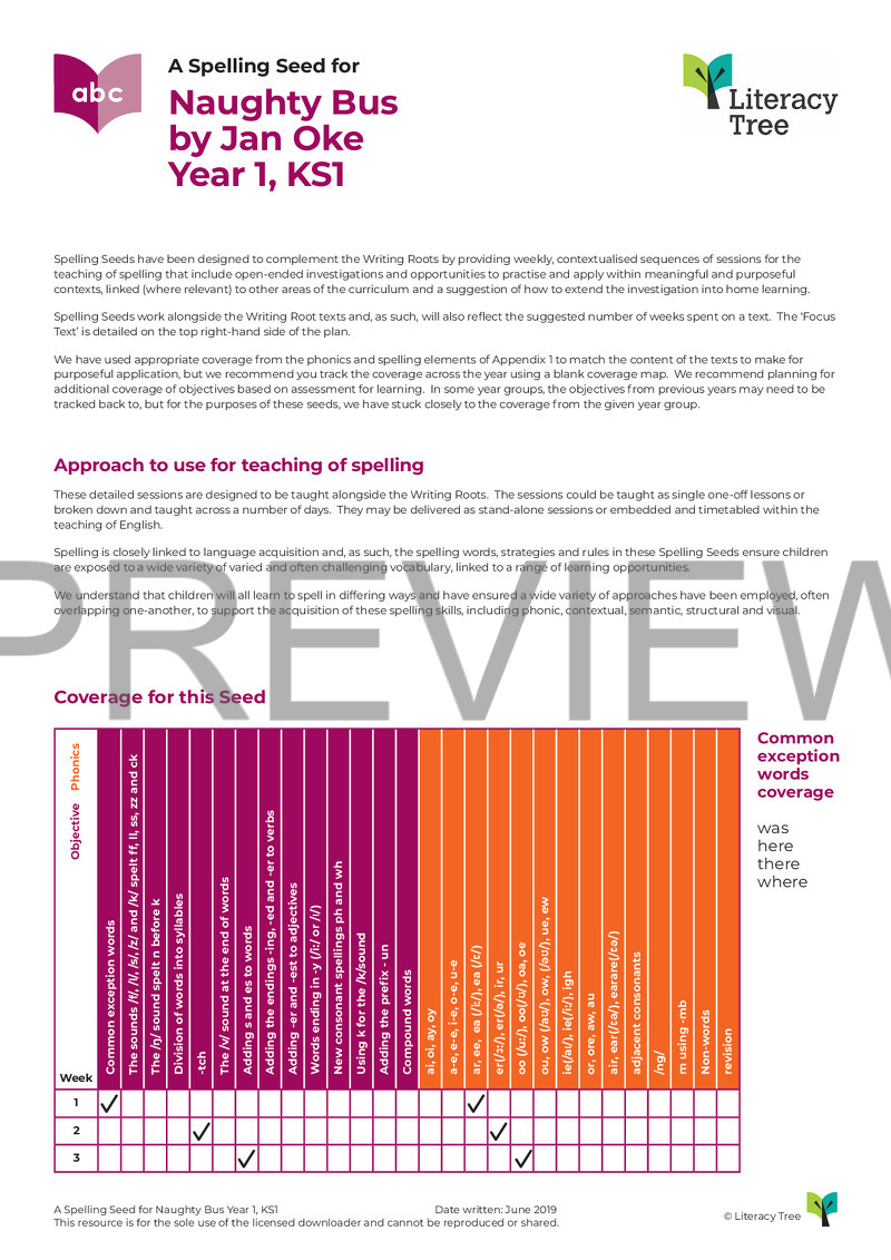 This is a three-session spelling seed for the book Naughty Bus by Jan Oke. Below is the coverage from Appendix 1 of the National Curriculum 2014.
