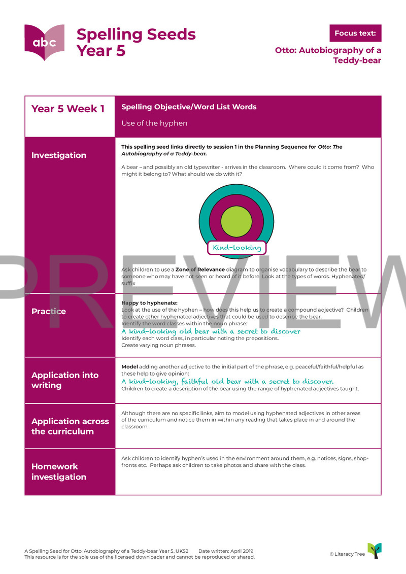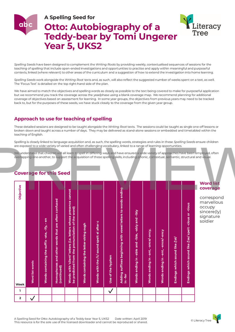 This is a two-session spelling seed for the book Otto: Autobiography of a Teddy-bear by Tomi Ungerer. Below is the coverage from Appendix 1 of the National Curriculum 2014.