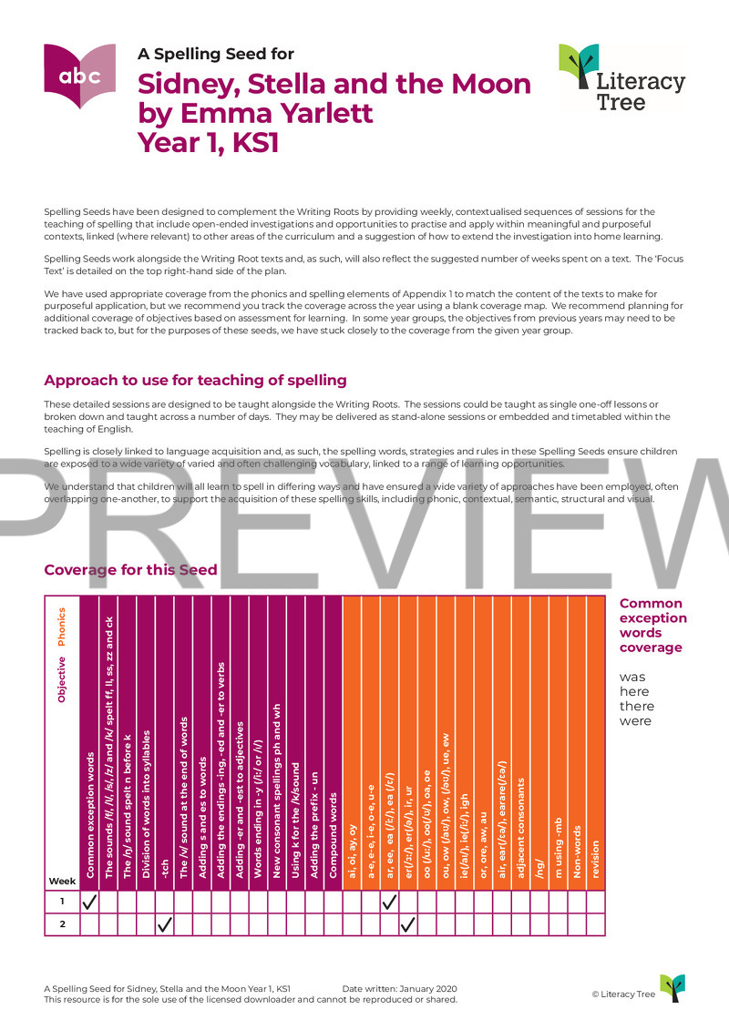 This is a two-session spelling seed for the book Sidney, Stella and the Moon by Emma Yarlett. Below is the coverage from Appendix 1 of the National Curriculum 2014.