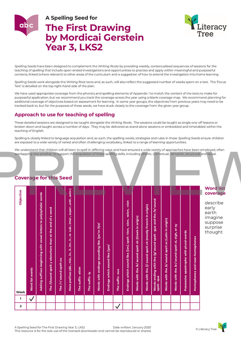 This is a two-session spelling seed for the book The First Drawing by Mordicai Gerstein. Below is the coverage from Appendix 1 of the National Curriculum 2014.
