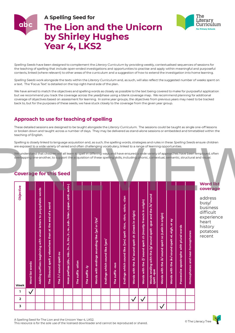This is a three-session spelling seed for the book The Lion and the Unicorn by Shirley Hughes. Below is the coverage from Appendix 1 of the National Curriculum 2014.