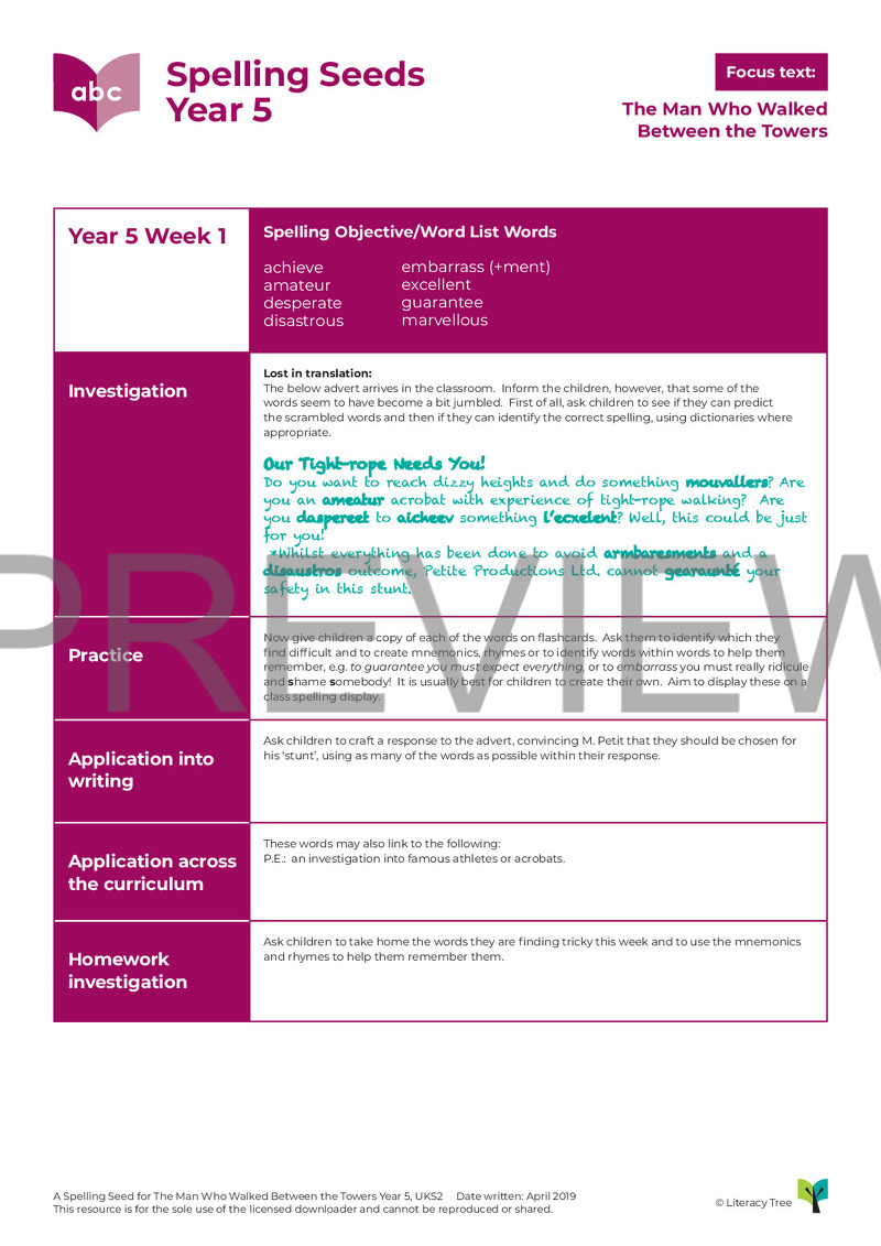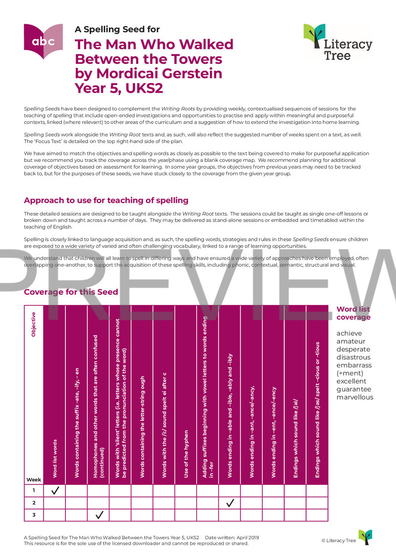This is a two-session spelling seed for the book The Man Who Walked Between the Towes by Mordicai Gerstein. Below is the coverage from Appendix 1 of the National Curriculum 2014.