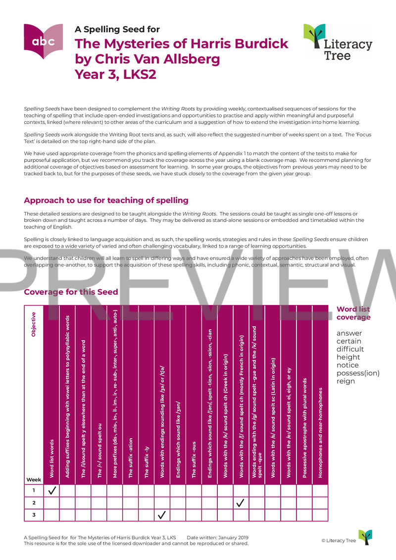 This is a three-session spelling seed for the book The Mysteries of Harris Burdick by Chris Van Allsberg. Below is the coverage from Appendix 1 of the National Curriculum 2014.