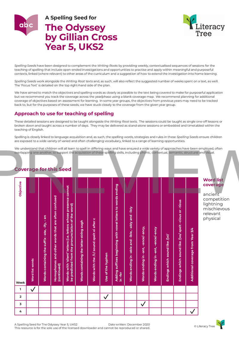 This is a three-session spelling seed for the book The Odyssey by Gillian Cross. Below is the coverage from Appendix 1 of the National Curriculum 2014.