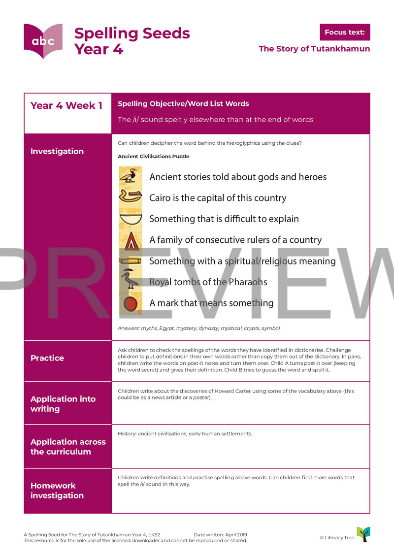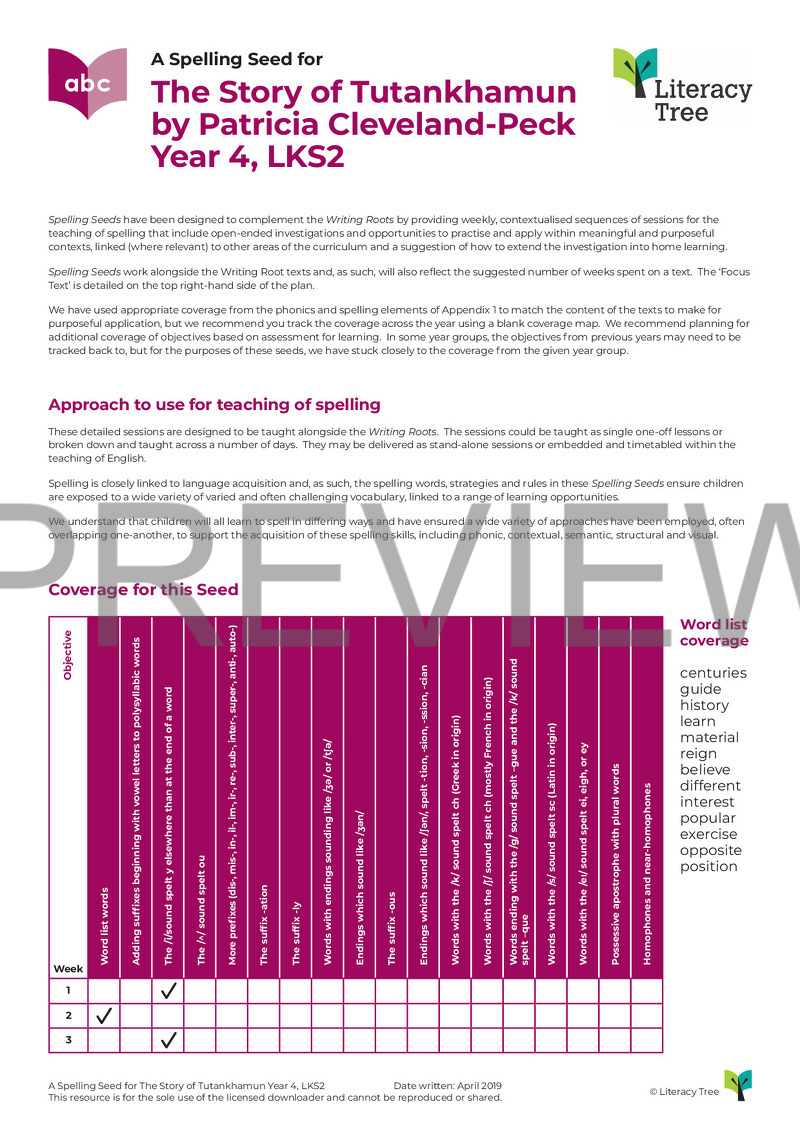 This is a three-session spelling seed for the book The Story of Tutankhamun by Patricia Cleveland-Peck. Below is the coverage from Appendix 1 of the National Curriculum 2014.