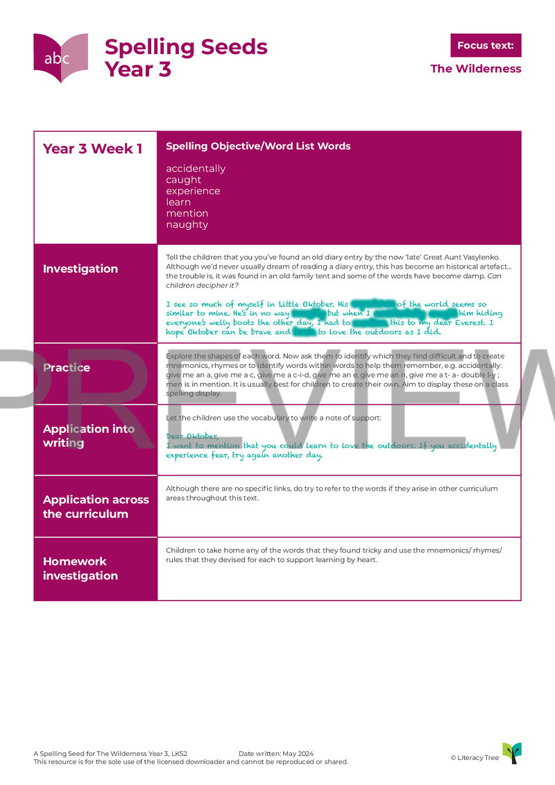 This is a three-session Spelling Seed for the book The Wilderness by Steve McCarthy. Below is the coverage from Appendix 1 of the National Curriculum 2014.